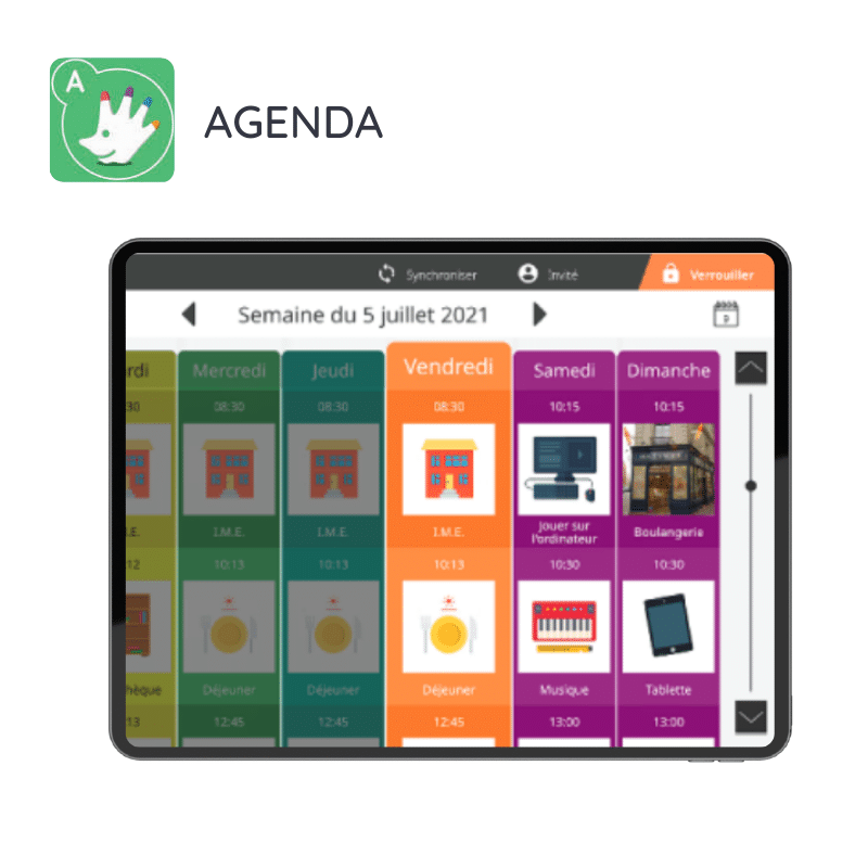Agenda est une application pensée pour aider à structurer la journée grâce à une organisation visuelle du temps. Elle permet de planifier facilement les activités quotidiennes sous forme de pictogrammes ou de photos, avec des couleurs et des horaires clairs.Chaque événement est représenté de manière simple, pour mieux anticiper les étapes de la journée, l’utilisateur peut consulter son planning à tout moment, avec la possibilité d’être alerté par des rappels visuels ou sonores.