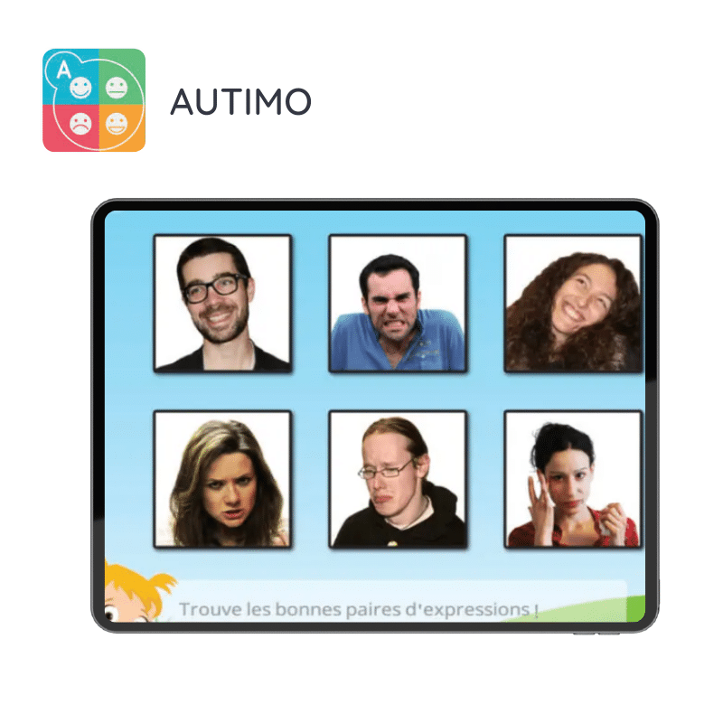 Autimo est une application qui aide à mieux comprendre les émotions et à développer leurs compétences sociales. À travers des jeux visuels, ils apprennent à reconnaître les expressions faciales, à associer une émotion à une situation, et à interpréter les indices sociaux. L'application est personnalisable avec ses propres photos et propose différents niveaux pour s’adapter au rythme de chaque utilisateur.