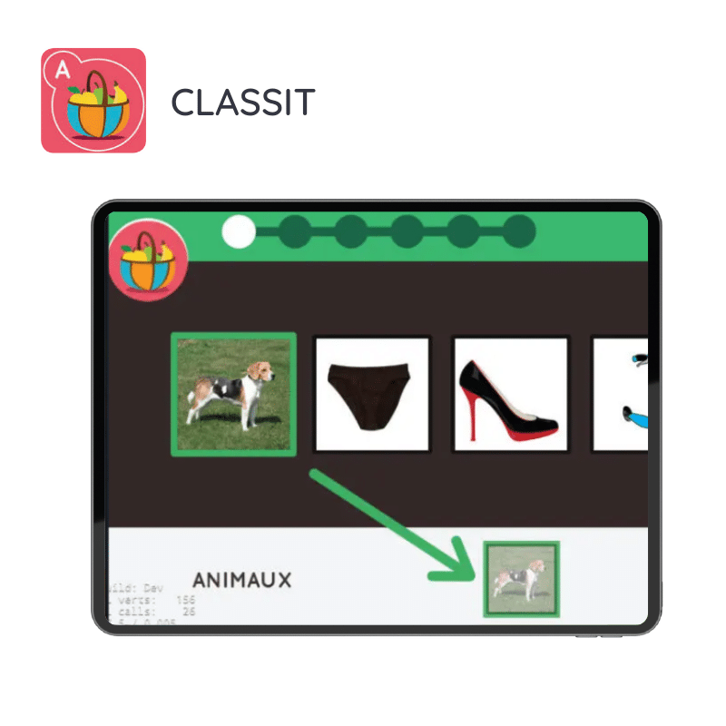 ClassIt est une application ludique qui aide à développer les capacités de tri, de catégorisation et de logique. L’utilisateur doit classer des images dans des catégories (comme « aliments », « vêtements », « objets du quotidien »...) en fonction de critères visuels ou thématiques. Chaque activité stimule l’attention, la mémoire visuelle et la compréhension des liens entre les objets.