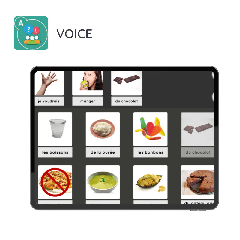 Voice est une application de communication qui permet aux utilisateurs de s’exprimer à l’aide de pictogrammes, images ou photos. Ils peuvent créer des phrases visuelles lues à voix haute par la tablette.