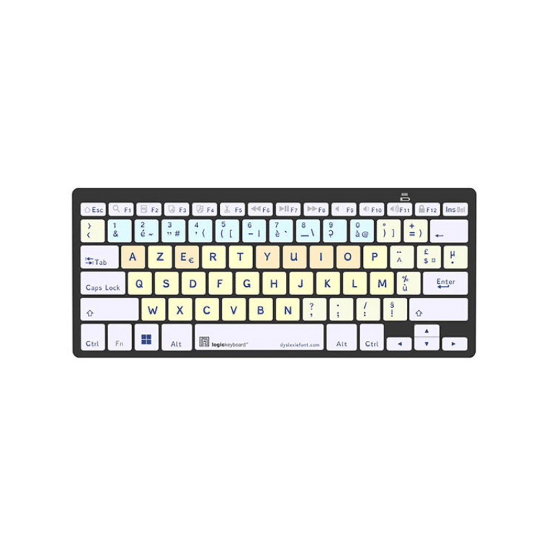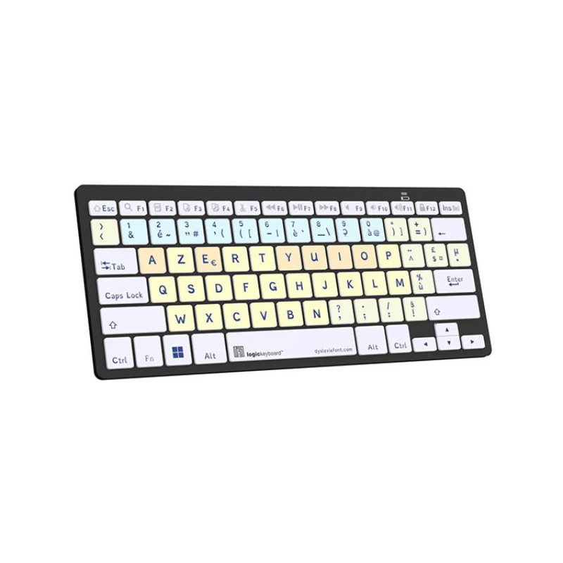 Le clavier Bluetooth Dyslexie Logickeyboard Mini a été spécialement conçu pour faciliter la lecture et la saisie pour les personnes dyslexiques ou dysorthographiques. Grâce à sa police adaptée et son code couleur intuitif, il permet de mieux repérer les touches, de limiter les erreurs et de gagner en confiance lors de l’écriture.