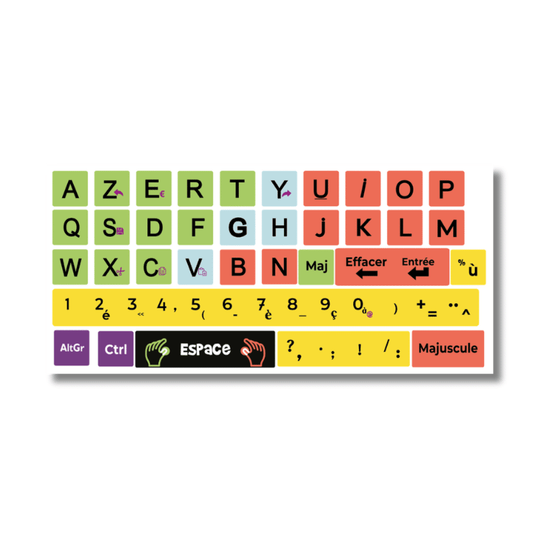 Le plateau Facil’Ordys aide l’enfant à mieux visualiser et structurer le clavier en s’appuyant sur une organisation claire et logique. Il segmente les touches en familles de lettres, avec des repères visuels simples et des astuces mnémotechniques pour faciliter la mémorisation.